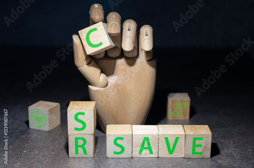 sztuczna dłoń układająca z klocków słowo CSR. Koncepcja Społecznej Odpowiedzialności Biznesu - kluczowe obszary