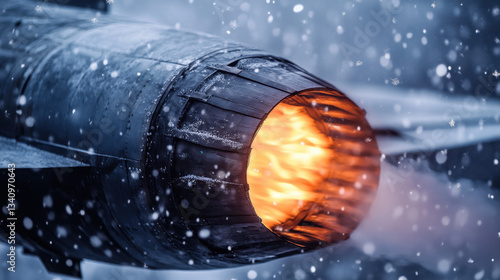 Close-up of a fighter jet engine captures the intense flames and smoke emitting from the exhaust in a snowy environment. The powerful mechanics highlight aviation technology amidst winter