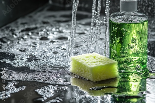 Dishwashing liquid and sponge with water splashes on shiny surface Generative AI