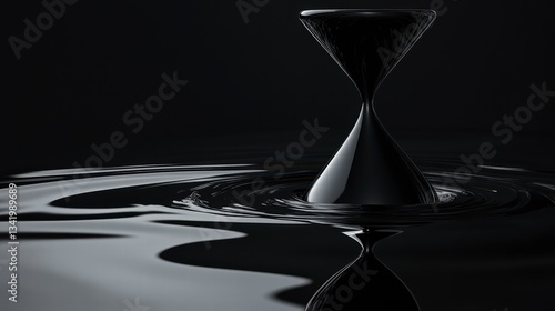 Time's Embrace: A single drop of liquid, forming a unique, elegant hourglass, gently falls back into a still black liquid, creating subtle ripples in a mesmerizing and contemplative scene.