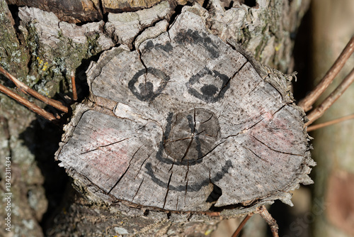 Close-up of a tree trunk on which a branch has been sawn off. A funny face is drawn on the cut surface. It looks as if it is looking out of the tree.