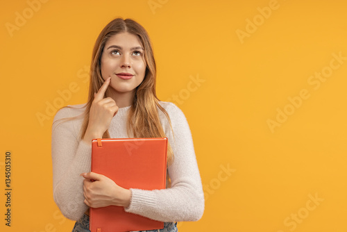 A thoughtful young woman holding an orange folder, looking up, against a yellow background