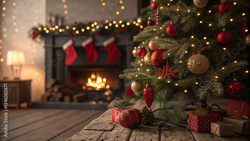 Cozy Christmas Scene with a Decorated Tree, Fireplace, and Festive Lights