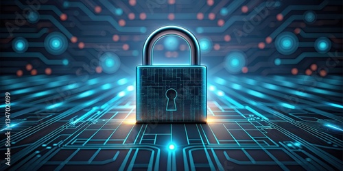 Digital shield representing cybersecurity protection and firewall defense. Digital lock symbolizing cybersecurity on a circuit board background.