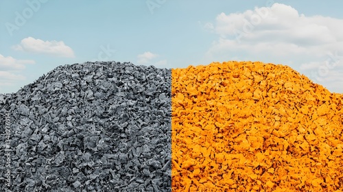 Contrast of Black and Orange Gravel Piles Under Blue Sky