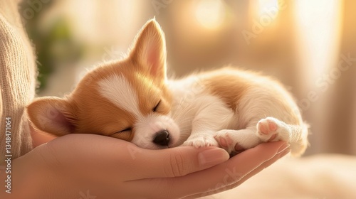 A tiny fluffy puppy curled up in someone's hands, peacefully sleeping, soft warm lighting, feeling of tenderness and love