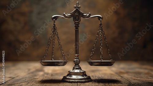 Vintage scales balancing various symbols of justice and fairness on a rustic wooden table displaying timeless appeal
