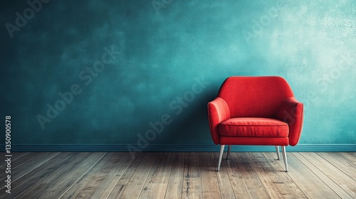 Modern red armchair stands against a textured teal colored wall