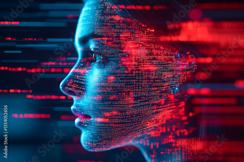 Un visage féminin qui surgit d'une interface virtuelle, fusionnant avec des lignes de code et des données numériques, symbolise l'intelligence artificielle et la technologie futuriste