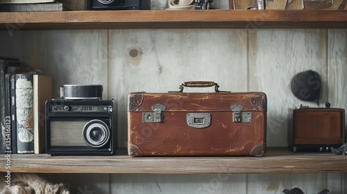 Nostalgic wooden shelf showcases an old leather suitcase, retro radio, and classic film camera, evoking warm memories of cozy moments and timeless adventures