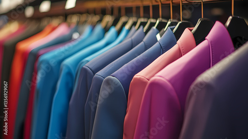 A Rainbow of Style: A vibrant row of tailored jackets hangs neatly on display, showcasing a spectrum of colors.