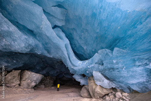 Dangerous ice cave entrance with huge hanging ice block overhead in the Swiss Alps Moteratsch Glacier. (March 2025)