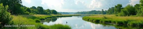A scenic view of the lush Ussuri River wetland landscape with diverse flora and fauna, lush, environment