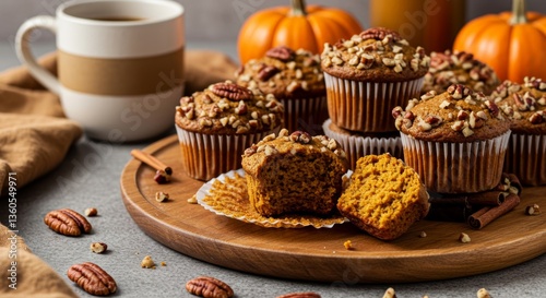 A cozy, rustic setting featuring vegan pumpkin spice muffins with a crunchy pecan topping. The muffins are arranged on a wooden platter, with a few broken open to reveal their moist texture.