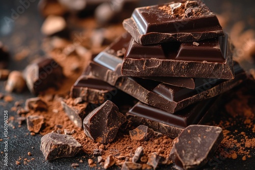 Dark chocolate pieces stacked, cocoa powder, dark background. Use Food photography