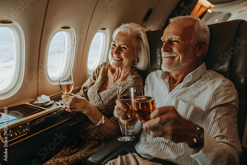 高齢夫婦が飛行機内で楽しむ贅沢な旅行の様子