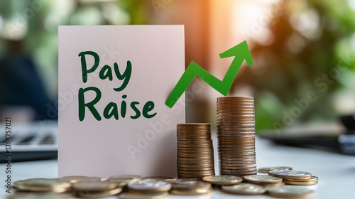 Employee Pay raise with green arrow upward with stack of coin on table with office background