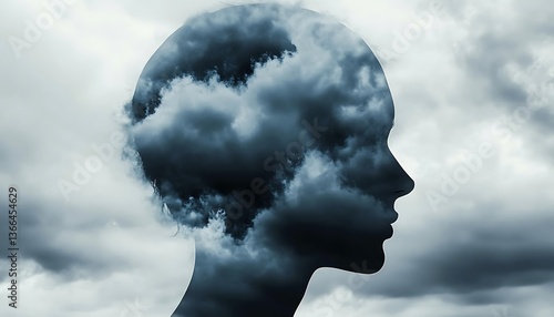 Mental depression and negative emotion concept. Person head silhouette and cloudy weather.