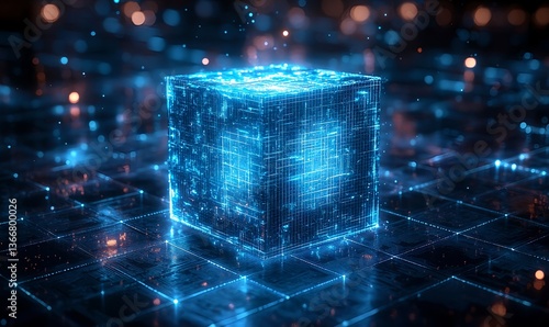 A digital art illustration of a holographic energy field with light rays, a technological grid, and a glowing blue cube symbolizing airflow