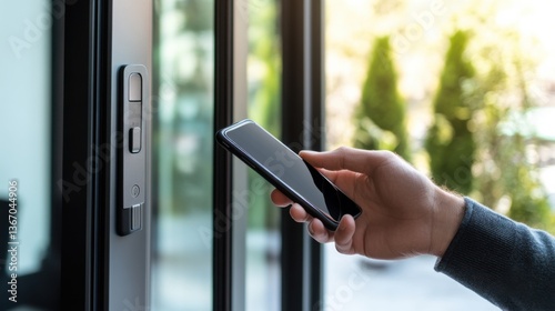 Person using a smartphone to control a smart lock on a door in a modern home, sleek home with clean lines and smart security features, High-tech style
