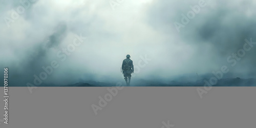 A lone soldier walks through a misty battlefield, a somber reflection of war's aftermath.