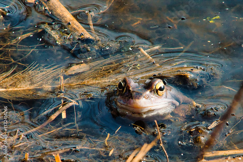 Zadowolona niebieska żaba moczarowa odpoczywa na bagnach po niebieskich godach