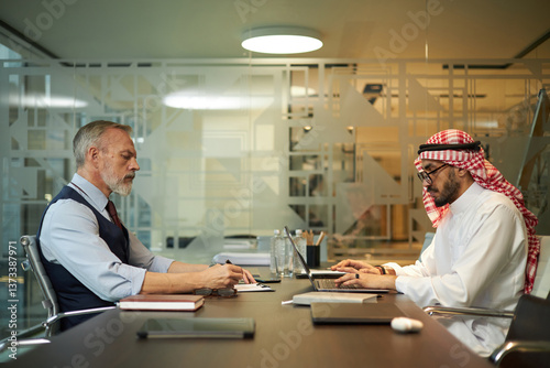 Side view of two ethnically diverse businessmen sitting at table in board room, typing on laptop and reading document
