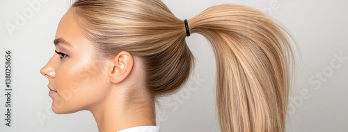 Beautiful blonde woman poses gracefully in side view, showcasing her long ponytail and elegance in a softly lit studio setting
