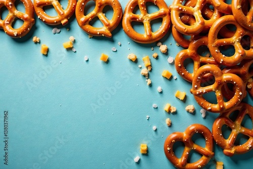 Overhead shot of scattered pretzels, salty snack , photography, light
