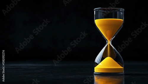 Countdown visualized by yellow sand trickling in an hourglass dark empty black background emphasizing the passage of time and urgency of a deadline approaching. Time running out.