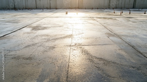 Freshly laid concrete slab with power trowel marks and anchor bolts in place