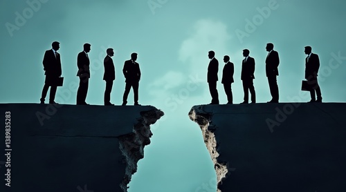 Business conflict concept, Silhouettes of people on opposite cliff edges.