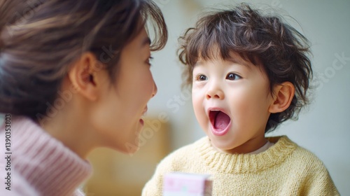 A loving mother and her surprised toddler share a joyful moment of pure happiness and amazement together.
