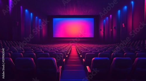 Empty neon-lit cinema auditorium, large screen, purple-pink gradient, movie premiere, advertising