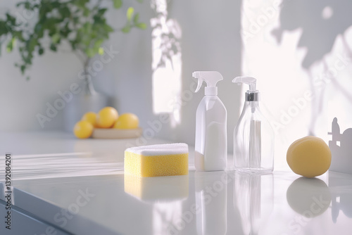 Clean Kitchen Setup with Lemons and Cleaning Supplies. A clean kitchen countertop with lemons, spray bottles, and a sponge creates a fresh and inviting atmosphere, all bathed in soft sunlight.