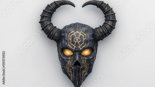 Ritualistic demon hunter mask with glowing ancient runes, curved horned details, and an eerie supernatural presence, displayed on white