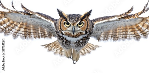 As it spreads its wings and rustles its feathers, a majestic solitary owl ascends into the sky, its sharp talons outstretched and its piercing gaze focused, contrasting sharply with the pure white