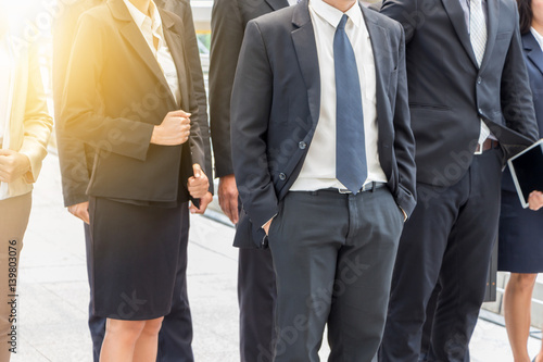 Group of happy young business team, businesspeople walking the outdoor office together, Success teamwork concept.