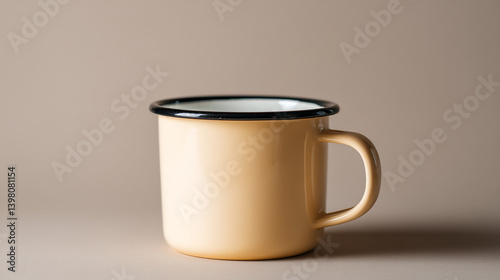 Close up shot of a yellow enamel mug with black trim on a neutral background in soft studio light