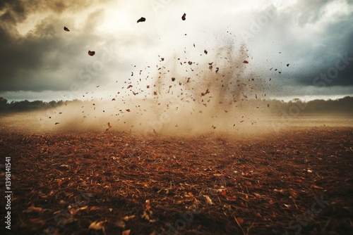 A whirlwind of leaves and dust lifts into the air in a rural area as the wind stirs up the earth beneath a cloudy sky Generative AI