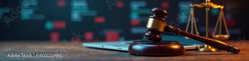 Gavel, laptop, scales of justice, network graphic, dispute, protection