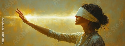 Surreal Blindfolded Woman Reaching for Glowing Door in Misty Evening