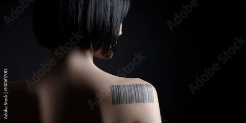 Young sad woman with a barcode tattoo on her shoulder. Concept of woman as a commodity, human trafficking, prostitution and sexual slavery