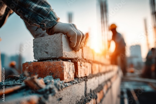 A bricklayer in action laying bricks on a sunny construction site, creating a strong brick wall with precision and care, building for the future.
