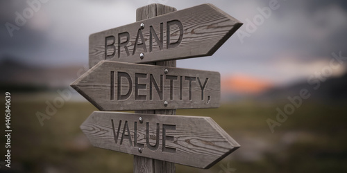 Wooden signpost with three directional arrows indicating "Brand," "Identity," and "Value," set against a blurred landscape background, symbolizing brand building choices and direction
