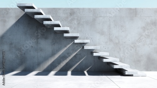 A minimalist concrete staircase casts long shadows against a smooth wall, creating a stark yet elegant visual contrast in a modern space, Modern Minimalist Architecture.