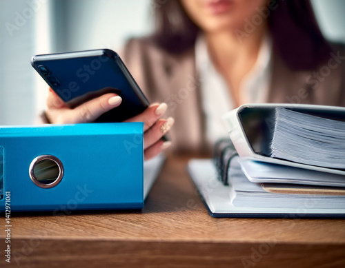 Kobieta pracująca przy biurku z telefonem i dokumentami – nowoczesne biuro tło