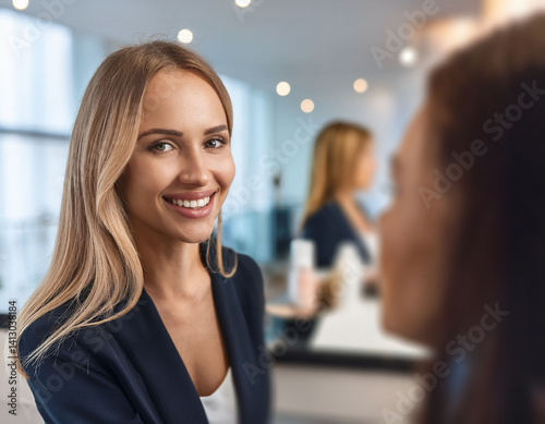 Uśmiechnięta recepcjonistka rozmawiająca z klientką – kontakt i profesjonalizm w miejscu pracy