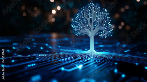 Digital tree with fiber-optic veins blossoms from electric blue circuit board, ambient light creates surreal technological garden