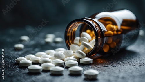 White Capsules Pouring from Bottle onto the Floor with a Blurred Background